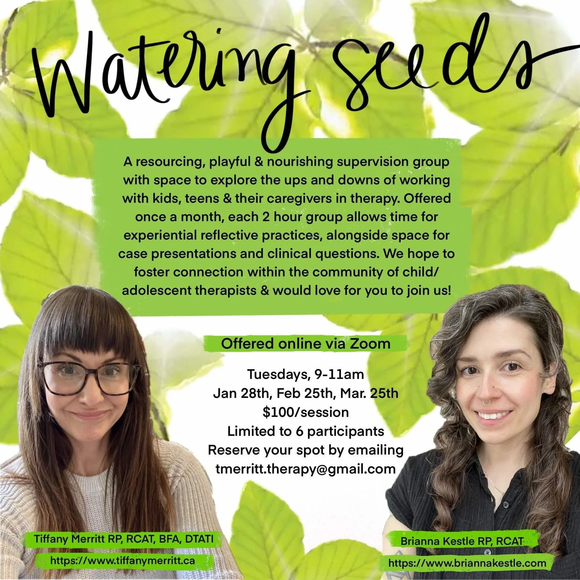 Starting in January 2025 Tiffany Merritt RP, RCAT, and Brianna Kestle RP, RCAT are offering Watering Seeds, a monthly drop-in supervision group focused on nourishment and connection for therapists who work with children, adolescents and parents.